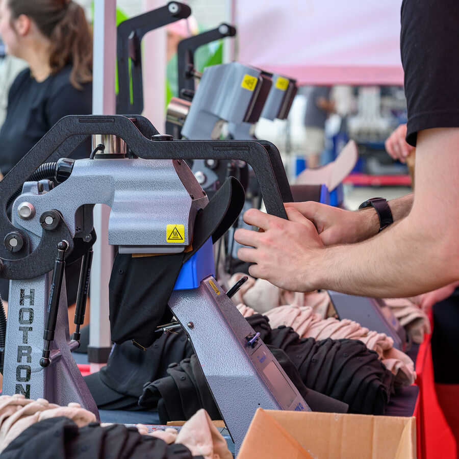 Take a lookBy far this is our most common activation type. Screen printing fits a wide range of garments and print locations. Guests LOVE the look of the spinning presses and the ability to see their shirts printed using this tried and true technique, plus the shirts are handed to them literally hot off the press!